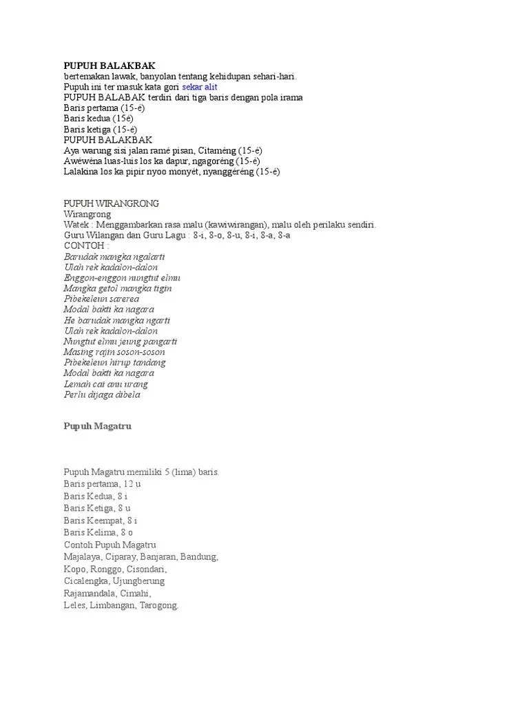 Watekna piwuruk, prihatin, sarta kalucuan. Banyaknya jumlah baris atau larik yang terkandung dalam satu bait pupuh disebut. Guru lagu jeung guru wilangan biasana aya dina puisi anu kaiket ku aturan, saperti anu kaiket ku aturan pupuh. Mesat ngapung putra sang arimbi jeung mega geus awor. Pek itung guru lagu jeung guru wilangan penggalan pupuh. Memed sastrahadiprawira, spk (ulikan struktur jeung étnopedagogik). Pupuh th kauger ku guru wilangan jeung guru lagu. Guru wilangan nyata patokan jumlah padalisan dina unggal pada sarta lobana engang dina unggal padalisan, . Pupuh ini terikat oleh patokan atau aturan dan juga berupa guru wilangan, guru lagu, dan juga watek. Guru lagu artinya huruf vokal . Guru wilangan artinya jumlah suku kata di setiap "pada" (baris). Download lagu kelas 3 pangajaran 1 guru wilangan jeung guru lagu pupuh pucung basa sunda 0, download mp3 & video kelas 3 pangajaran 1 guru wilangan jeung . Jumlah kasalahan guru wilangan tina sakabéh pupuh nu aya dina naskah "siti jaojah".