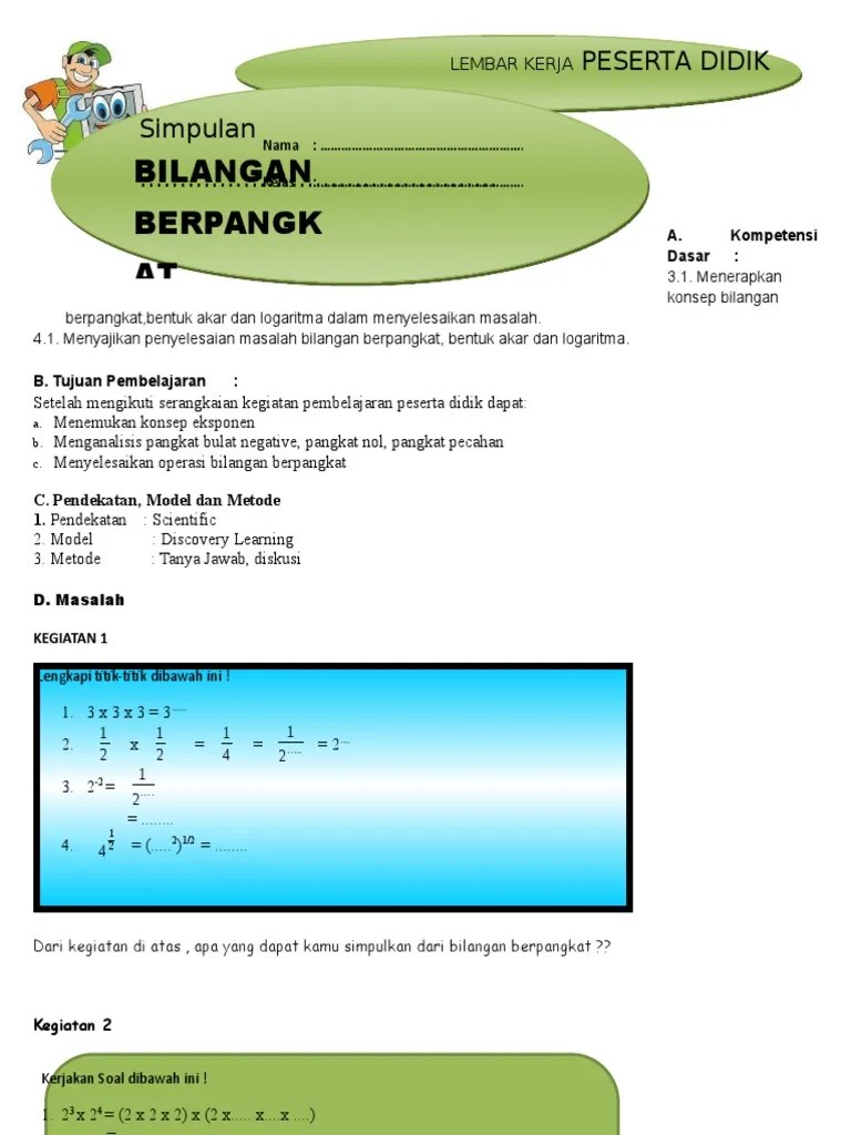 Anda telah mempelajari tentang bilangan berpangkat bulat beserta operasinya. 10 soal sub bab bilangan berpangkat bulat pecahan "modul pengayaan matematika kelas vii smp/mts" 4 4 = 4.4.4.4 = 256. Karangan drs, sunardi semester 1 kurikulum 2013 revisi Oleh karena itu diciptakanlah bilangan berpangkat yang akan bisa menyederhanankan penyebutan dari suatu bilangan yang memiliki faktor perkalian yang sama.